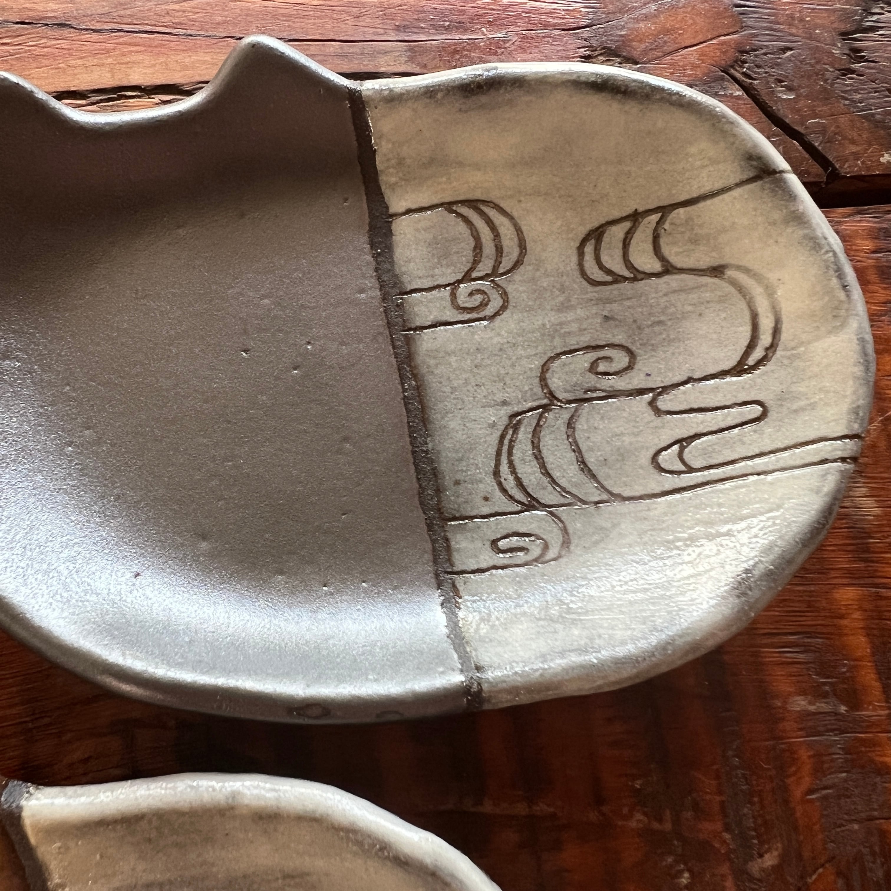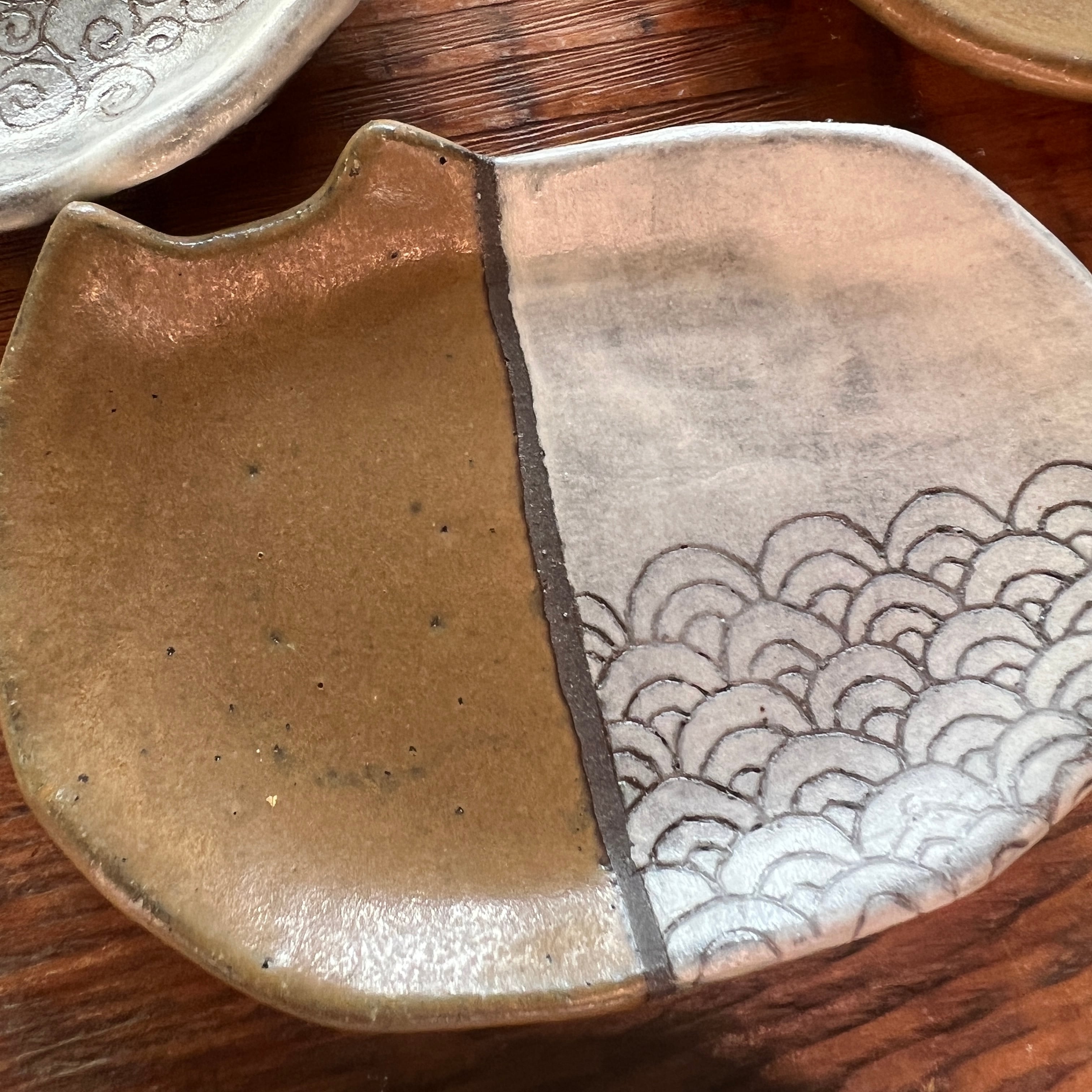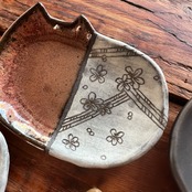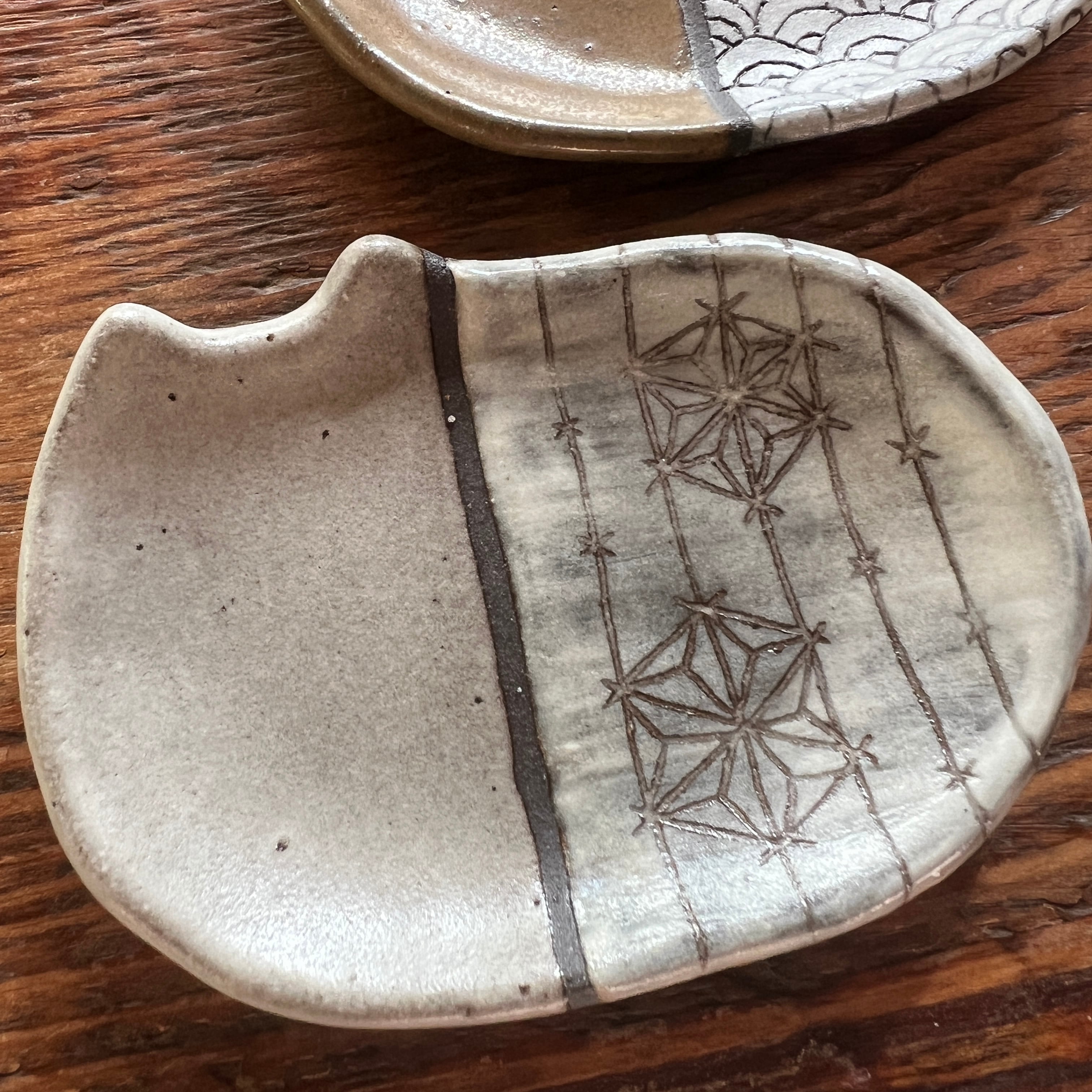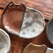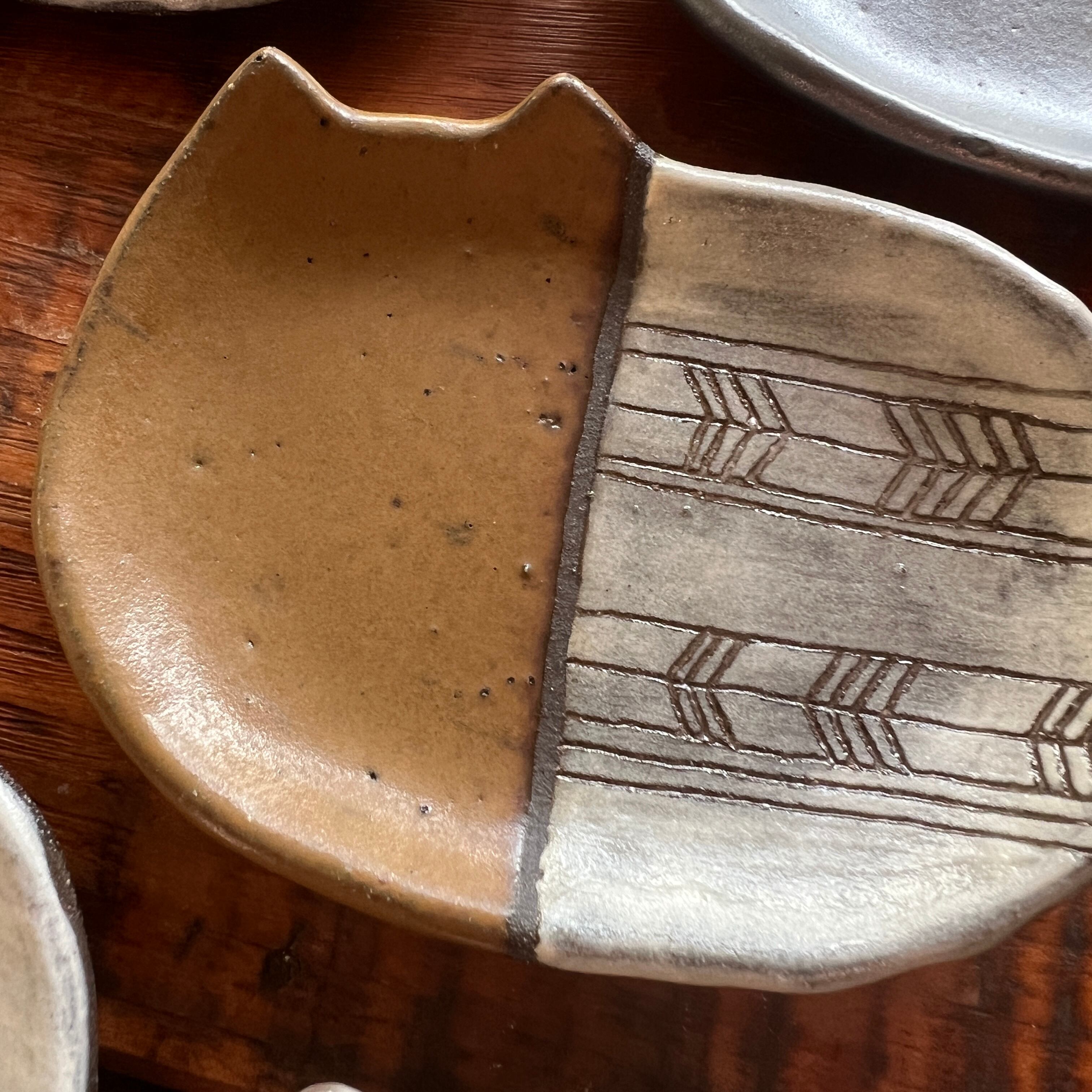 小さな猫のお皿に、和の文様を白化粧の掻き落としで描きました。
