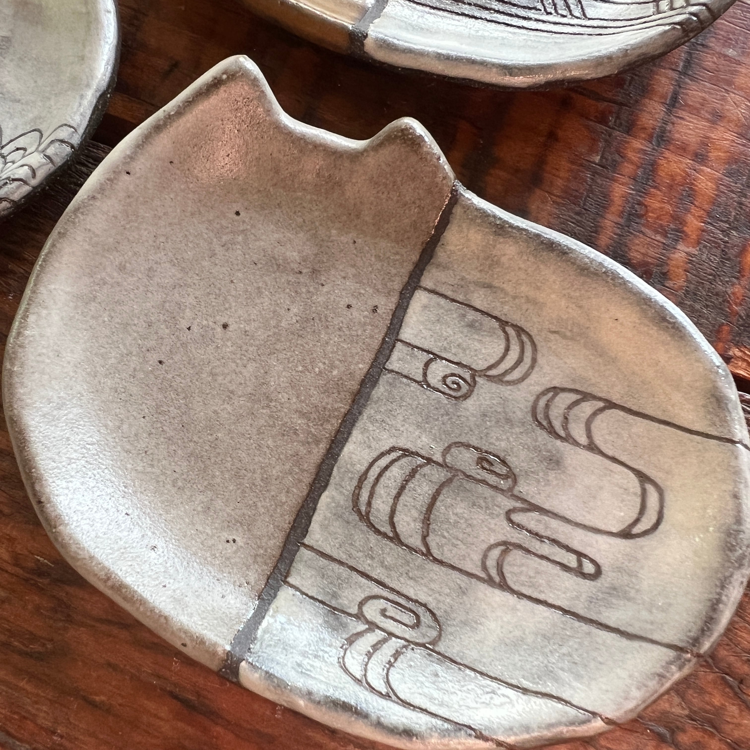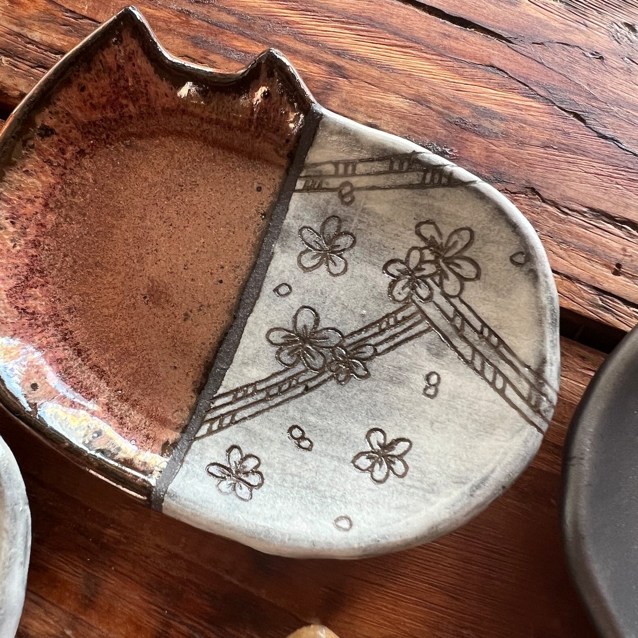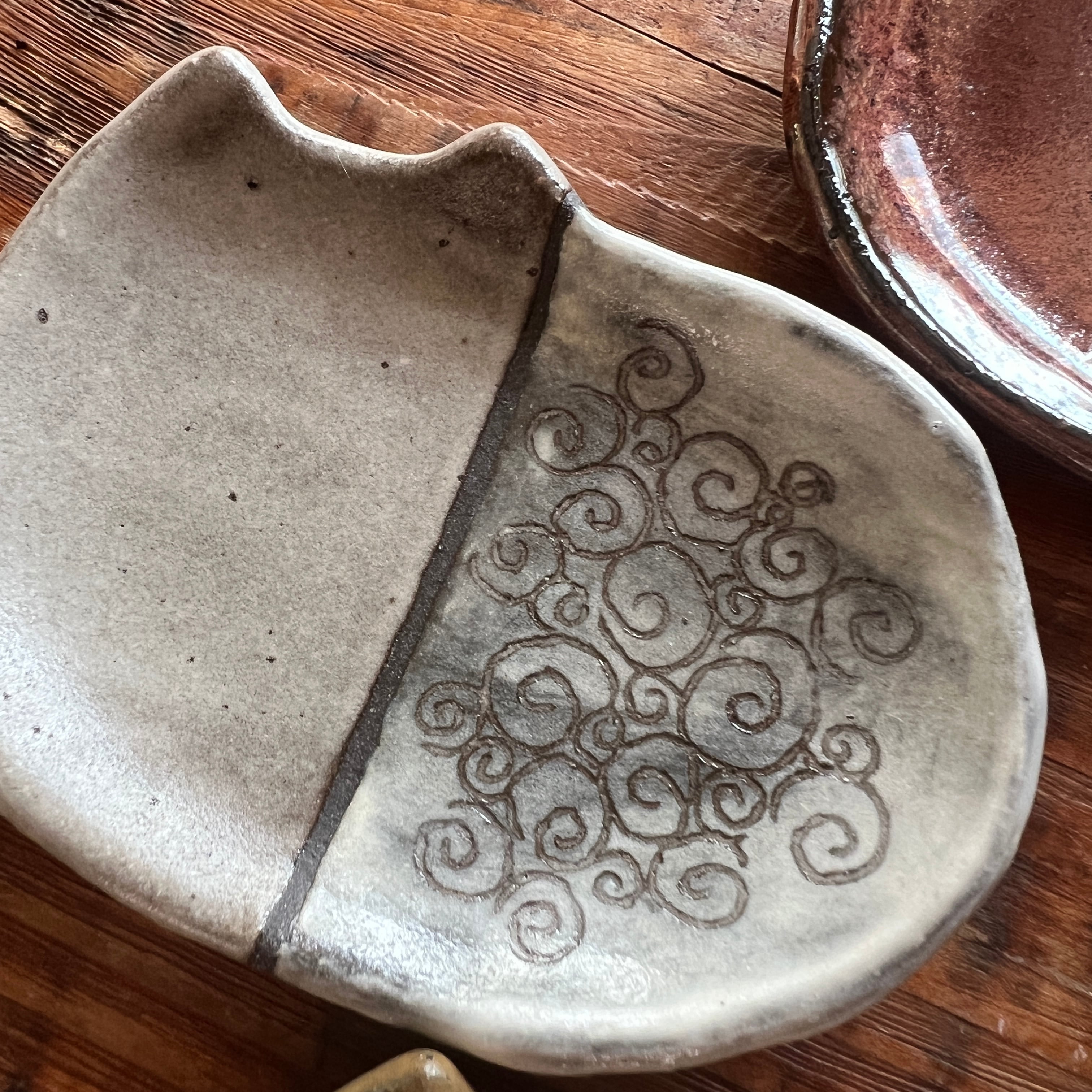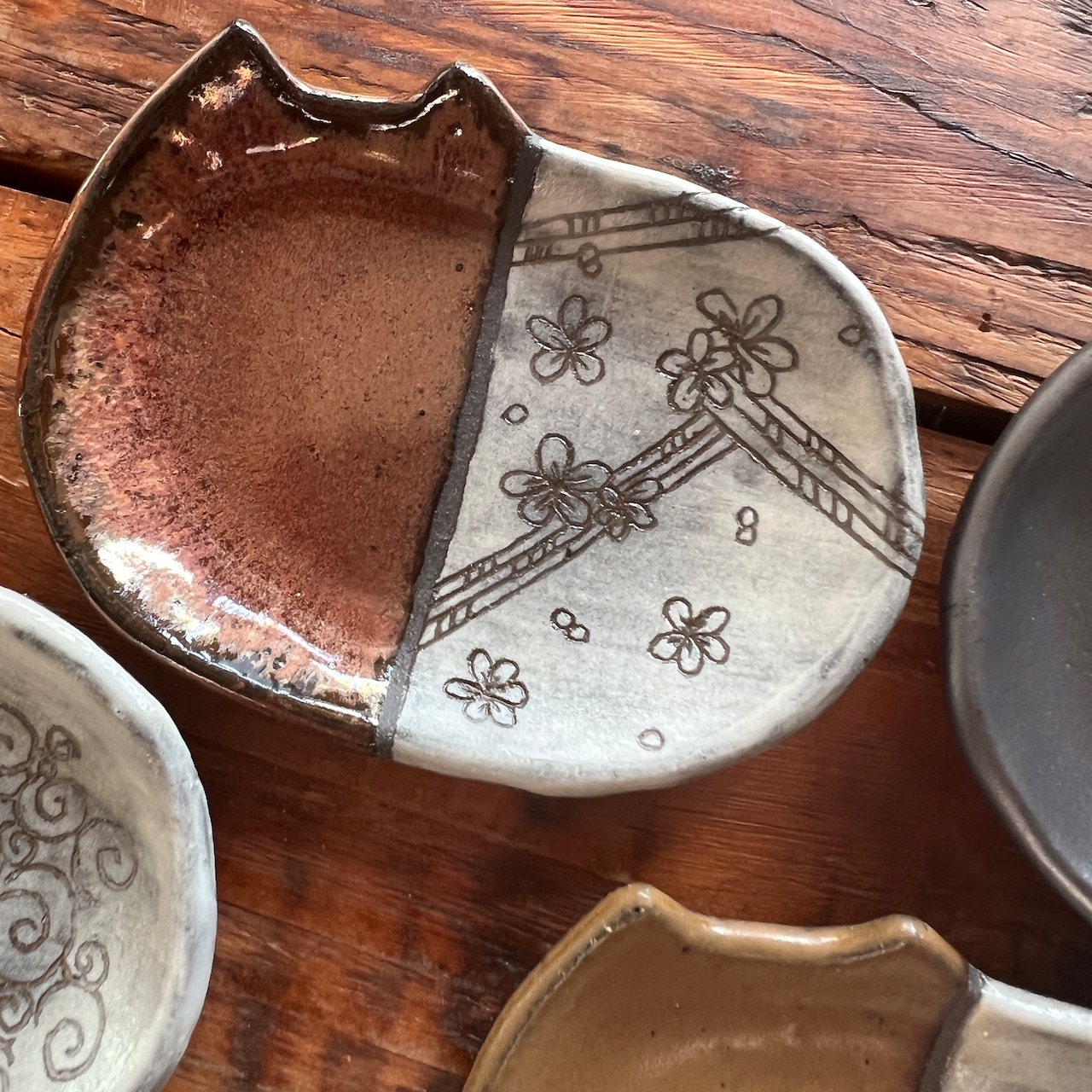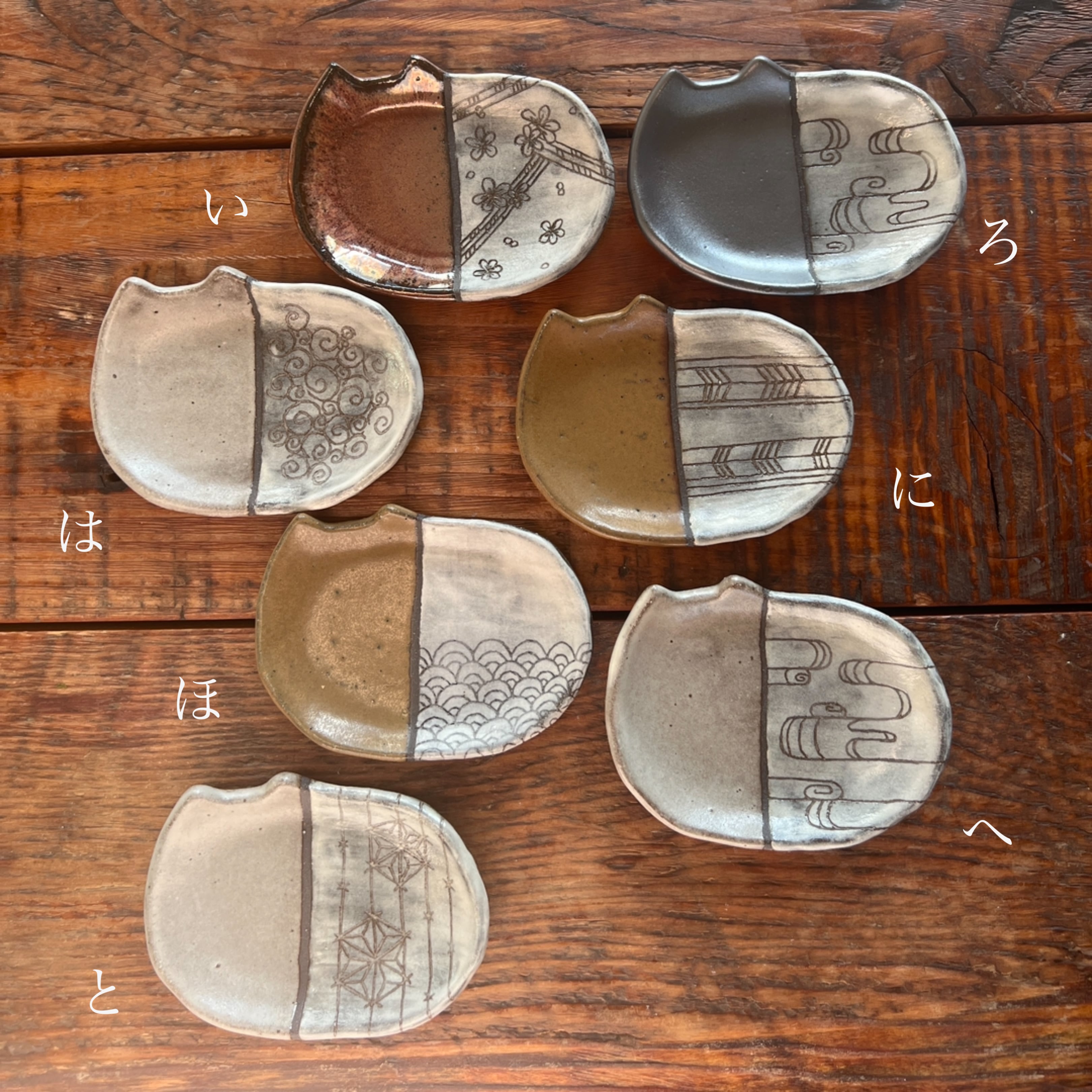 小さな猫のお皿に、和の文様を白化粧の掻き落としで描きました。